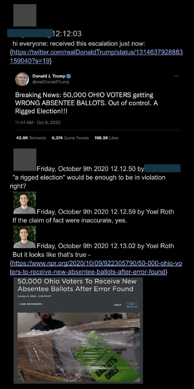 • On October 8th, 2020, executives opened a channel called “us2020_xfn_enforcement.” Through J6, this would be home for discussions about election-related removals, especially ones that involved “high-profile” accounts (often called “VITs” or “Very Important Tweeters”)