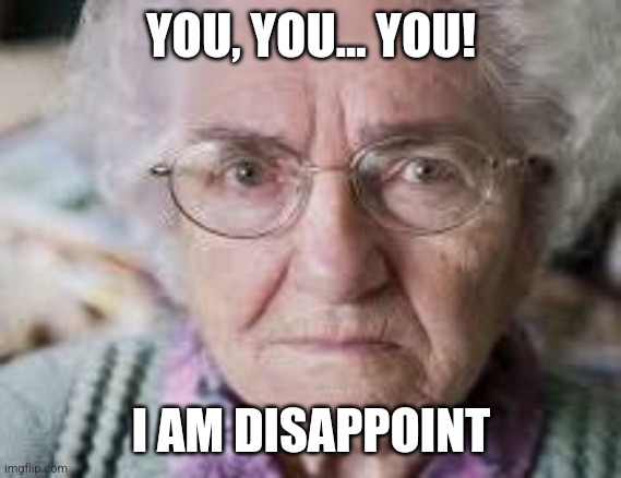 Slow movement of head left to right. Looking over the reading glasses. Hands on hips. Rolled up newspaper in right hand.
