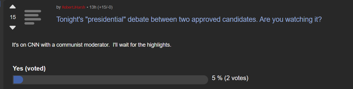 I didn't watch it. There's no point. I already know Biden's a vegetable and Trump's not going to say anything I don't already know. I equate it to internet blood sports and I wasn't into that either.