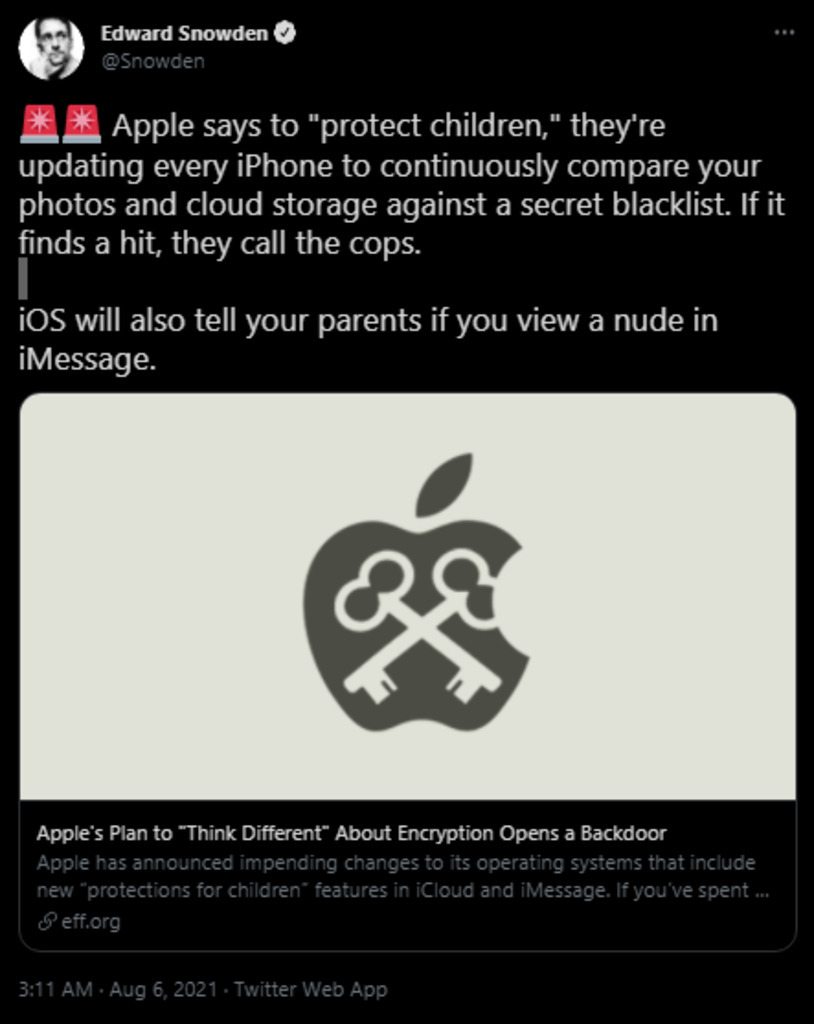 Apple will actively scan your Iphone and snitch you to the cops if it detects illegal content.